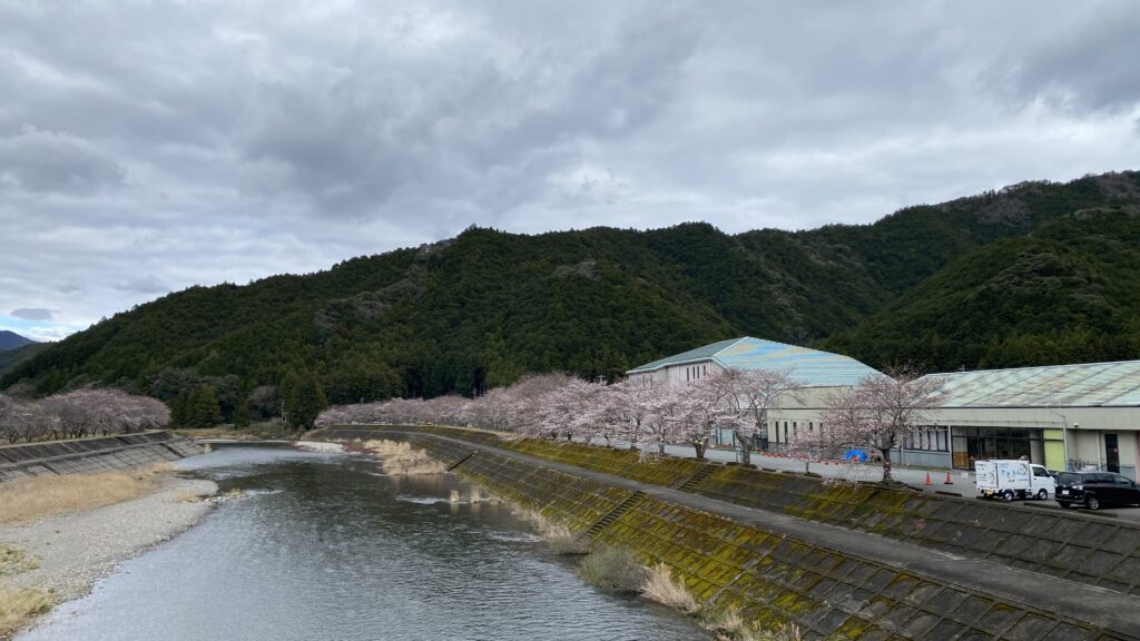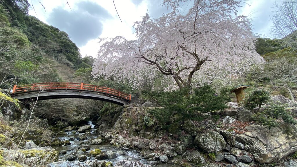 周囲の山々に囲まれた渓谷に咲く枝垂れ桜。風情ある景色とともに春のひとときをお楽しみください。