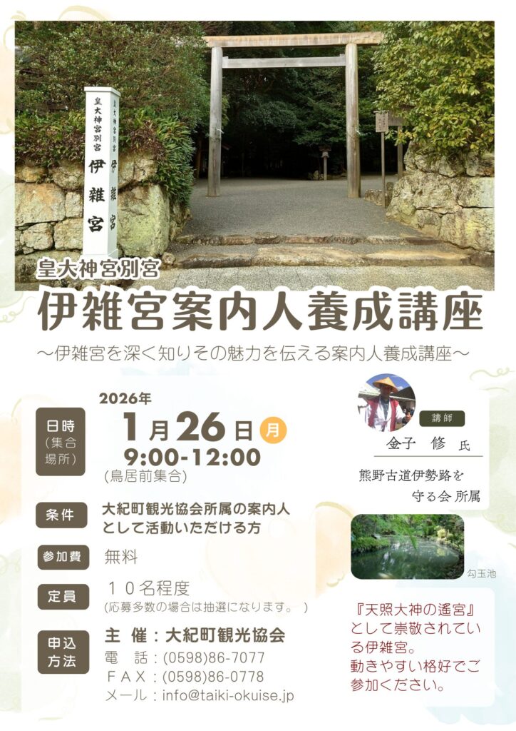 1月26日(月)、皇大神宮(内宮)別宮・伊雑宮の案内人養成講座を開催します。